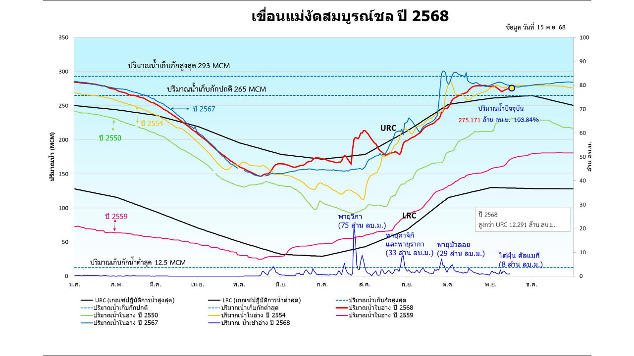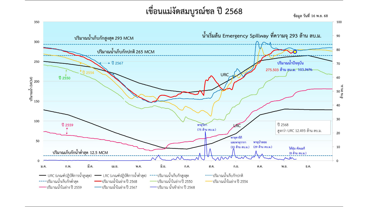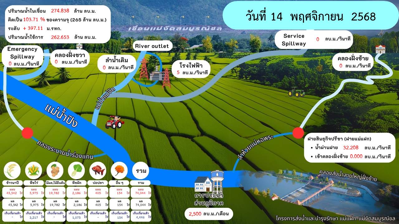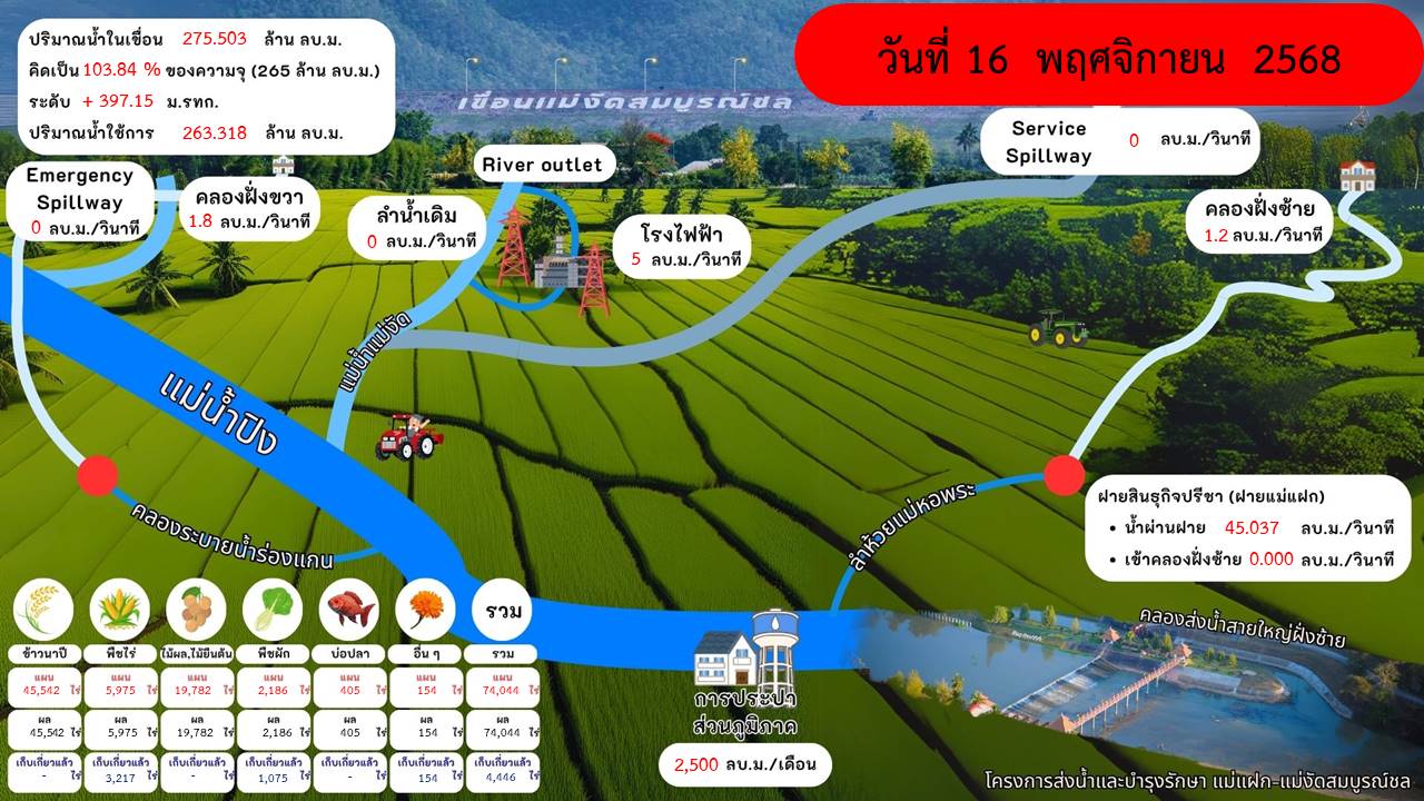 สถานการณ์น้ำ วันที่ 1 พฤษจิกายน 2568 เวลา 07.00 น. เขื่อนแม่งัดสมบูรณ์ชล มีปริมาณน้ำ 275.503 ล้าน ลบ.ม คิดเป็น 103.96 % ***ระบายผ่านโรงไฟฟ้า 5 ลบ.ม./วินาที ***ระบายผ่าน River outlet 0 ลบ.ม./วินาที ***ระบายน้ำผ่าน Service spillway 0 ลบ.ม./วินาที ***ปริมมาณน้ำล้น Emergency Spillway 0 ลบ.ม./วินาที คลองฝั่งขวา 1.8 ลบ.ม./วินาที คลองฝั่งซ้าย 1.2 ลบ.ม./วินาที ------ ปริมาณน้ำผ่านฝายแม่แฝก 45.037 ลบ.ม./วินาที ------ ปริมาณน้ำเข้าคลองสายใหญ่แม่แฝก 0.000 ลบ.ม./วินาที